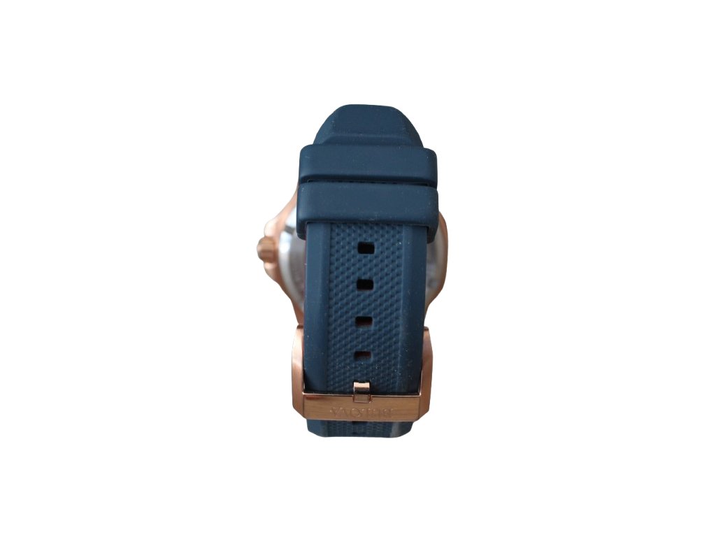 Modrý číselník se strukturovaným obvodem a hladkým středem, jenž je podkladem plastickým číslicím na pozicích hodin, je chráněn minerálním sklíčkem. Nepřehlédnutelným prvkem je vedle samotného tvaru pouzdra také průhled na setrvačku strojku na pozici sedmé hodiny spolu s mimostřednou vteřinovou ručkou na páté hodině. Růžovozlaté ručky hodinek jsou opatřeny luminiscencí a usnadňují tak odečet při zhoršených světelných podmínkách. Hodinky pohání mechanický strojek Miyota s automatickým nátahem a rezervou chodu kolem 42 hodin. Chod strojku je možné sledovat také proskleným dýnkem. Pouzdro doplňuje kontrastní pryžový řemínek. Hodinky disponují vodotěsností 200 m, není je tak třeba odkládat ani při plavání.
