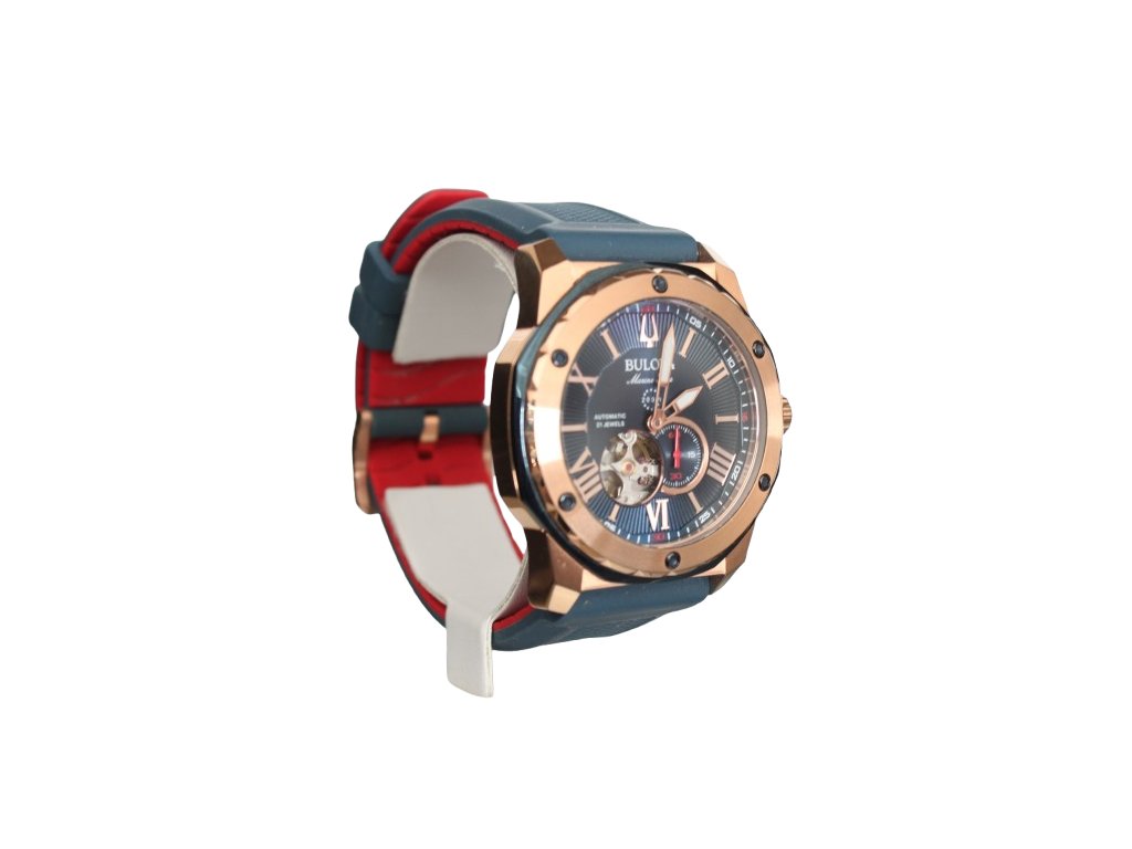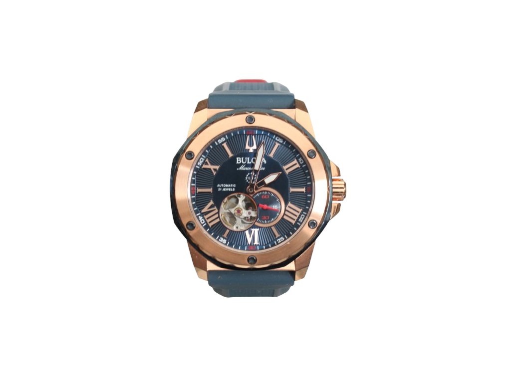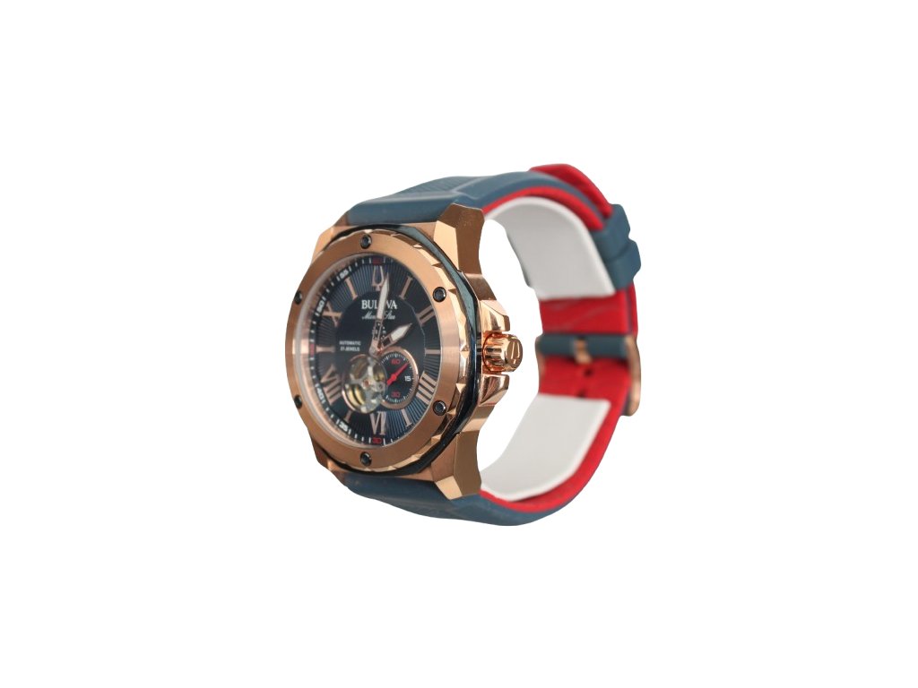 Pánské sportovní hodinky Bulova Marine Star 98A227 na první pohled upoutají především výrazným vzhledem, modrým strukturovaným číselníkem a růžovozlatým pouzdrem, doplněným modročerveným řemínkem.
